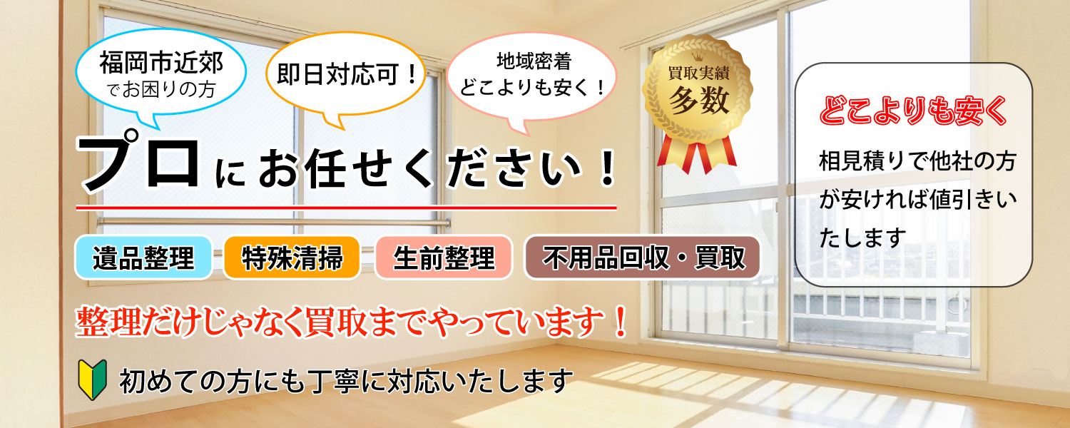 さくらやは、必ず事前にお見積もりをお出しし、お見積もり以上の金額を頂くことは決してございません。そして、お客様の負担を少しでも減らすべく、努力を惜しみません。対応地域を福岡市近郊に限定しておりますのも、移動費の削減や信頼できる地元企業との連携による経費削減により、お客様のご負担を少しでも減らそうという理由からです。